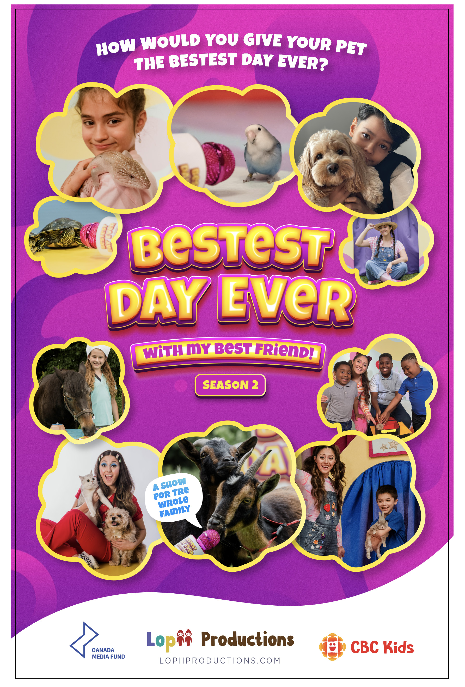 Bestest Day Ever with My Best Friend; where kids give their deserving loveable bestie (whether they are furry, fuzzy or slithery) a day they both will never forget! In every episode of Bestest Day Ever, host Lisette meets up with a wonderful young pet owner and their beloved pet. We hear about their bond and what makes their relationship so special, and Lisette (occasionally with a guest) teaches our awesome owners a special way they can say thank you with a DIY toy, treat or enrichment that will make their day. After their pet gives their new treat a try, they head over to the Surprise Zone, where they are given a once-in-a-lifetime experience, customized to the pet's personality and their favourite things to do.
